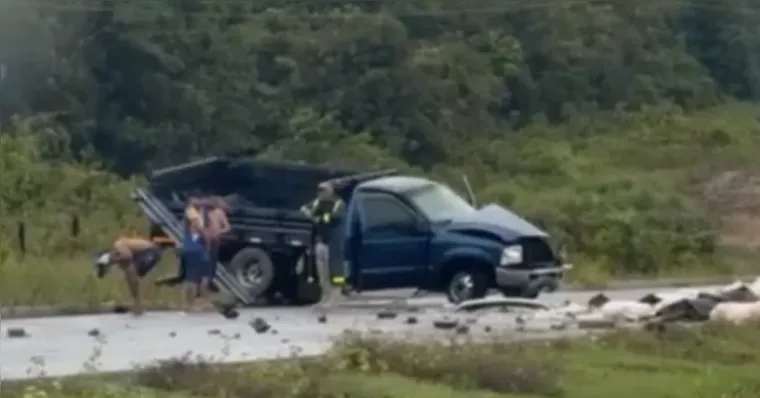 Imagens compartilhadas nas redes sociais mostram uma caminhonete com danos na parte dianteira após a colisão. O veículo permaneceu sobre a pista, com peças espalhadas pela rodovia.