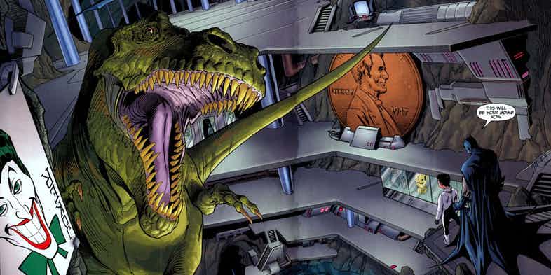 Então, tudo começou em Batman #35 quando o herói e Robin foram desafiados a sobreviver em um ilha super tecnológica, conhecida como Ilha do Dinossauro, que era povoada, bem… com dinossauros mecânicos. Os donos da ilha se comprometeram a doar uma boa quantia de dinheiro para a caridade. Houve tentativa de fraude por lado dos proprietários, mas não funcionou e Batman e Robin saíram como vitoriosos, levando muito mais que o dinheiro. O T-Rex é totalmente funcional, tendo servido como arma para Batman em mais de uma ocasião.