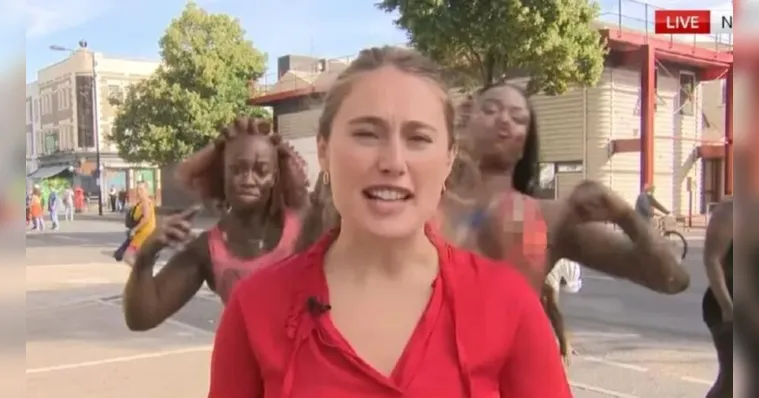 Neste domingo (28), uma dessas cenas inusitadas aconteceu durante a entrada ao vivo da repórter Madeline Ratcliffe, da emissora Sky News, enquanto acontecia a celebração do "Carnaval de Notting Hill", tradicional festa da cidade de Londres, no Reino Unido.