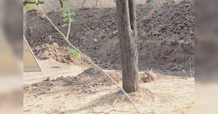 O leopardo está deitado do lado esquerdo da árvore, acima do monte de terra. Ele está longe e parece pequeno.